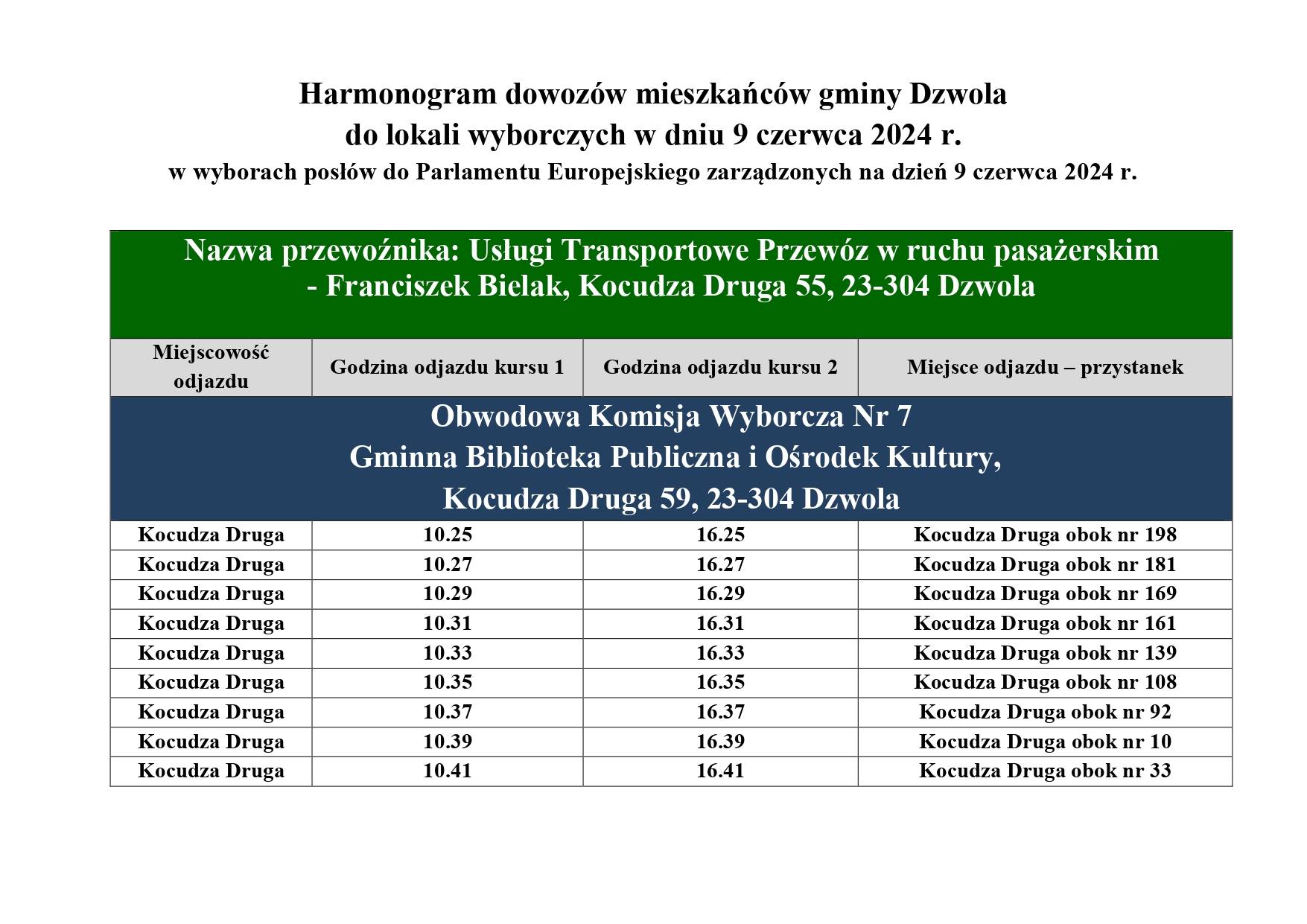 Mając powyższe na względzie Wójt Gminy Dzwola informuje, iż w dniu wyborów posłów do Parlamentu Europejskiego zarządzonych na dzień 9 czerwca 2024 r. uruchomione zostaną na terenie Gminy Dzwola niżej wskazane bezpłatne linie komunikacyjne, na trasie których w dniu głosowania odbędą się dwa pełne kursy wg niniejszego rozkładu. Powrót odbędzie się na tej samej trasie (autobus zatrzyma się na wymienionych wyżej przystankach w odwrotnym kierunku) – odjazd sprzed lokalu wyborczego.
