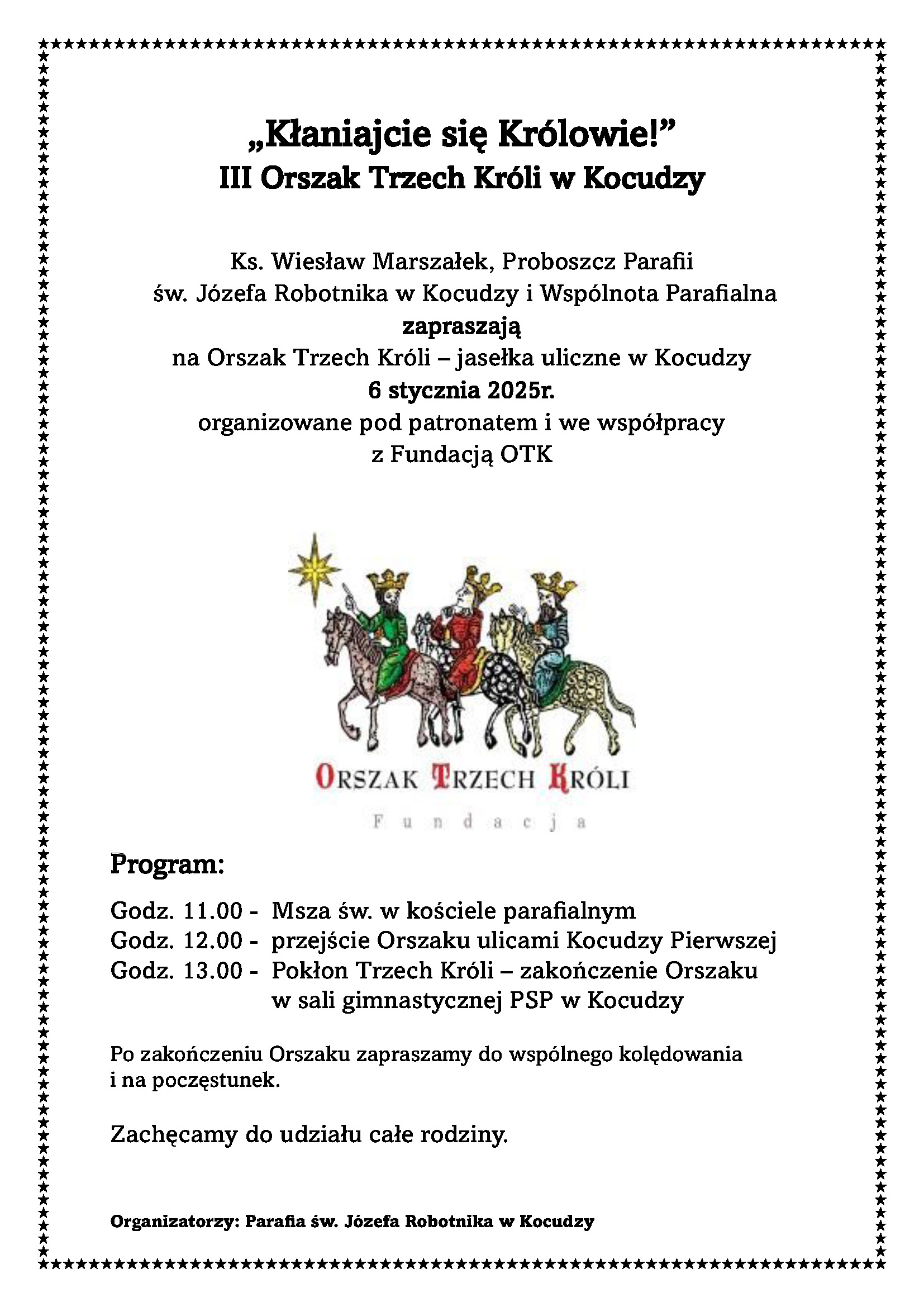 Ks. Wiesław Marszałek, Proboszcz Parafii św. Józefa Robotnika w Kocudzy i Wspólnota Parafialna zapraszają na Orszak Trzech Króli – jasełka uliczne w Kocudzy 6 stycznia 2025r. organizowane pod patronatem i we współpracy z Fundacją OTK.