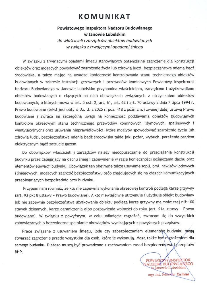 Komunikat Opublikowano dnia: 8 stycznia 2026 - 08:49 Komunikat Powiatowego Inspektora Nadzoru Budowlanego do właścicieli i zarządów obiektów budowlanych w związku z trwającymi opadami śniegu. Liczba wyświetleń: 5
