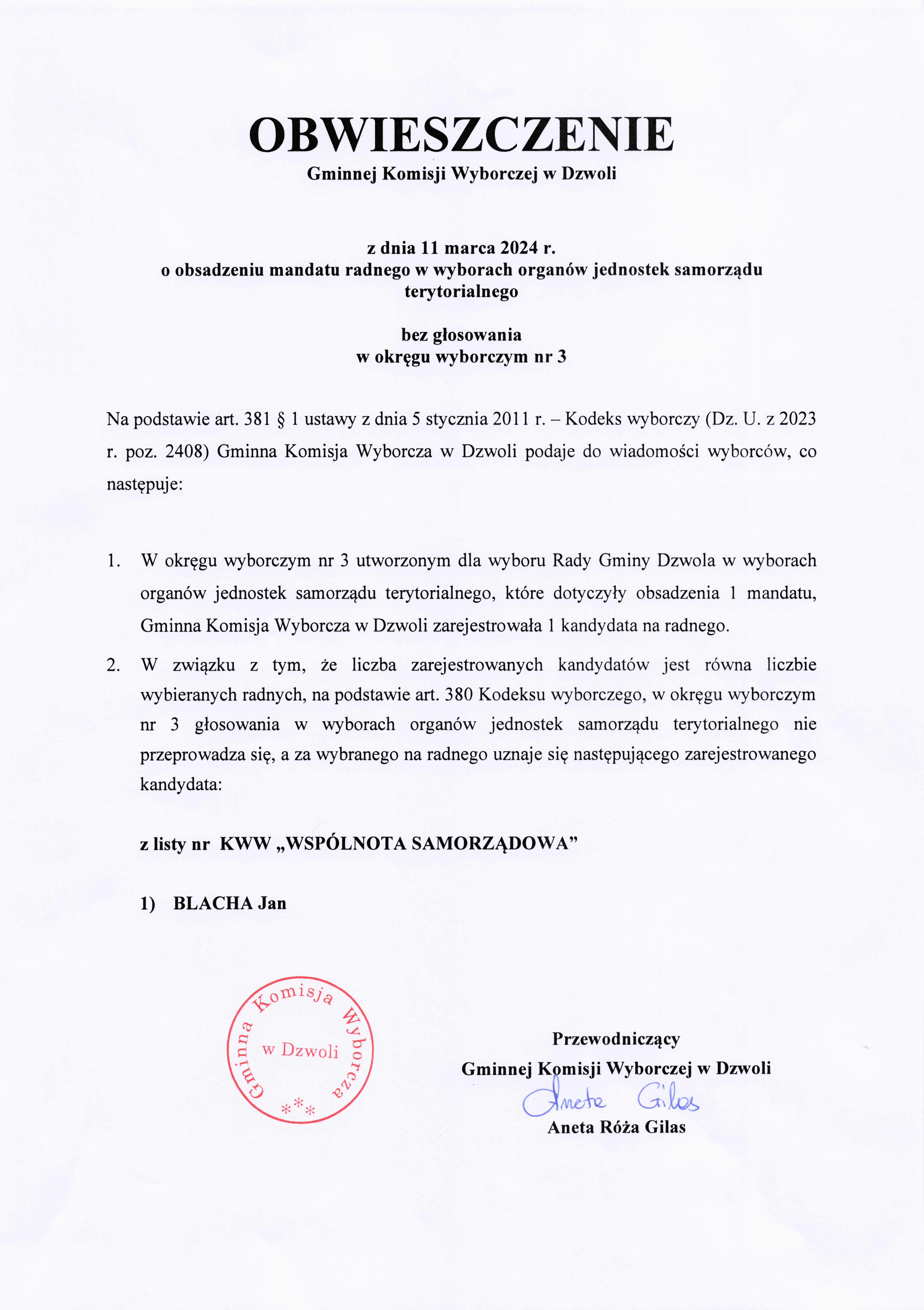 Na podstawie art. 381 § 1 ustawy z dnia 5 stycznia 2011 r. – Kodeks wyborczy (Dz. U. z 2023 r. poz. 2408) Gminna Komisja Wyborcza w Dzwoli podaje do wiadomości wyborców, co następuje: