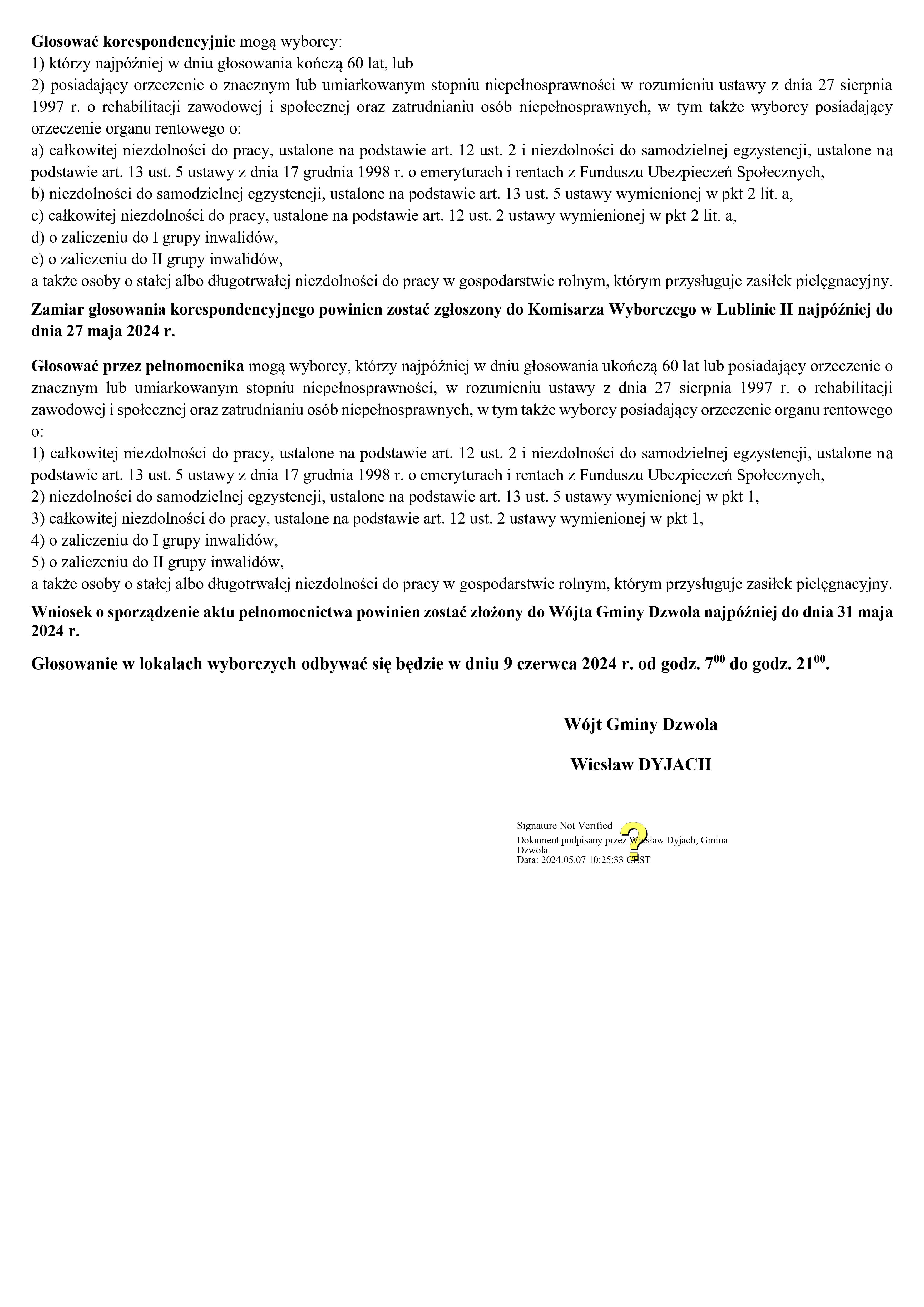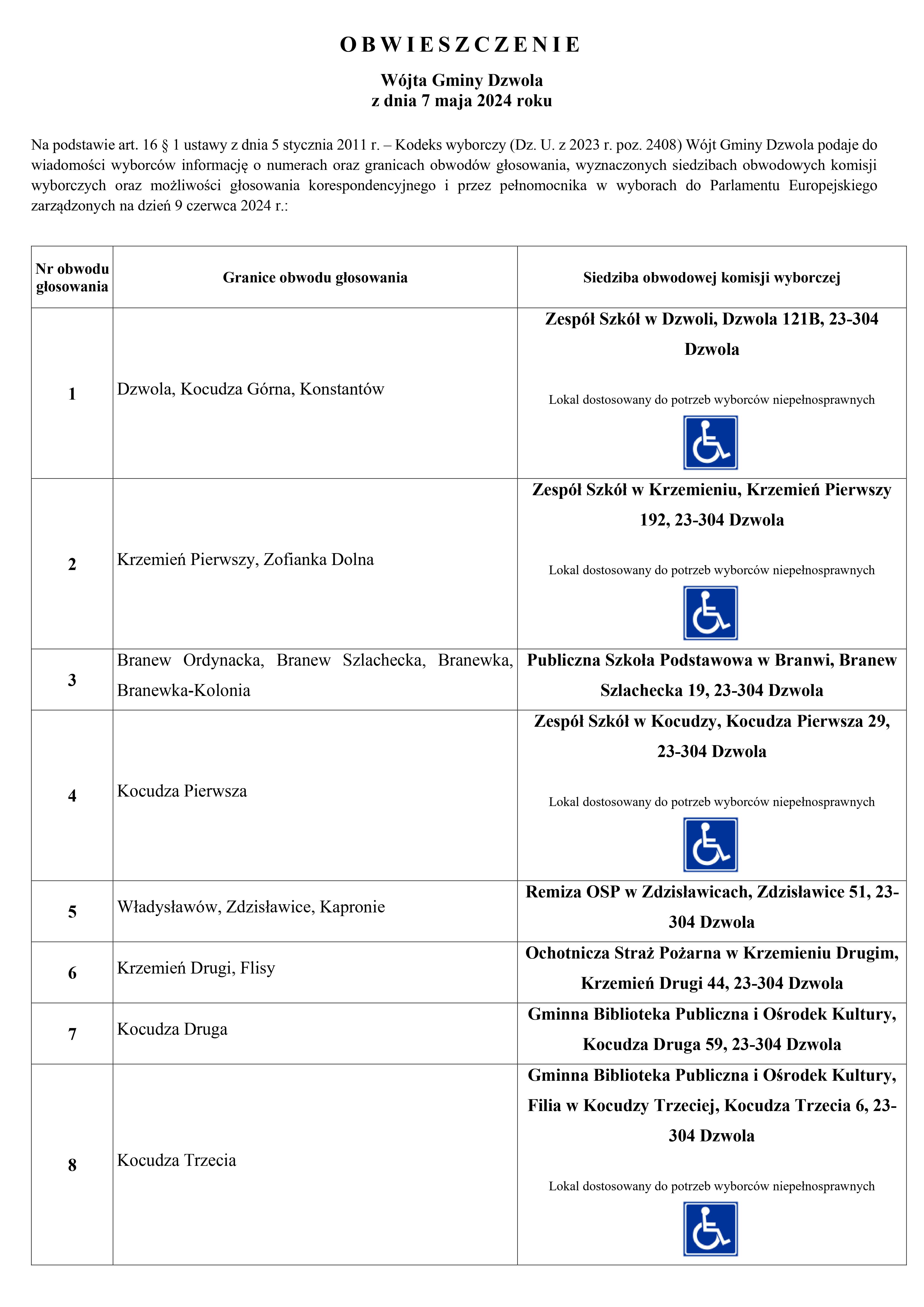 Na podstawie art. 16 § 1 ustawy z dnia 5 stycznia 2011 r. – Kodeks wyborczy (Dz. U. z 2023 r. poz. 2408) Wójt Gminy Dzwola podaje do wiadomości wyborców informację o numerach oraz granicach obwodów głosowania, wyznaczonych siedzibach obwodowych komisji wyborczych oraz możliwości głosowania korespondencyjnego i przez pełnomocnika w wyborach do Parlamentu Europejskiego zarządzonych na dzień 9 czerwca 2024 r.: