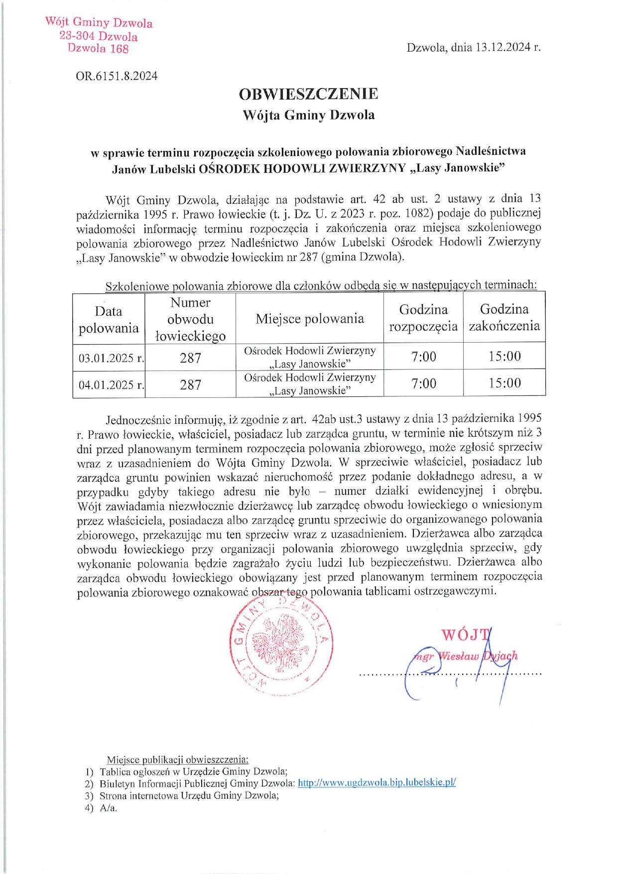Jednocześnie informuję, iż zgodnie z art. 42ab ust.3 ustawy z dnia 13 października 1995 r. Prawo łowieckie, właściciel, posiadacz lub zarządca gruntu, w terminie nie krótszym niż 3 dni przed planowanym terminem rozpoczęcia polowania zbiorowego, może zgłosić sprzeciw wraz z uzasadnieniem do Wójta Gminy Dzwola. W sprzeciwie właściciel, posiadacz lub zarządca gruntu powinien wskazać nieruchomość przez podanie dokładnego adresu, a w przypadku gdyby takiego adresu nie było – numer działki ewidencyjnej i obrębu. Wójt zawiadamia niezwłocznie dzierżawcę lub zarządcę obwodu łowieckiego o wniesionym przez właściciela, posiadacza albo zarządcę gruntu sprzeciwie do organizowanego polowania zbiorowego, przekazując mu ten sprzeciw wraz z uzasadnieniem. Dzierżawca albo zarządca obwodu łowieckiego przy organizacji polowania zbiorowego uwzględnia sprzeciw, gdy wykonanie polowania będzie zagrażało życiu ludzi lub bezpieczeństwu. Dzierżawca albo zarządca obwodu łowieckiego obowiązany jest przed planowanym terminem rozpoczęcia polowania zbiorowego oznakować obszar tego polowania tablicami ostrzegawczymi.