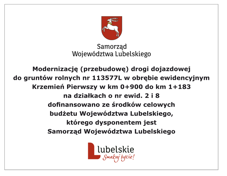 W dniu 22 lipca 2025 r. dokonano odbioru zadania inwestycyjnego obejmującego „Modernizację (przebudowę) drogi dojazdowej do gruntów rolnych nr 113577L w obrębie ewidencyjnym Krzemień Pierwszy w km 0+900 do km 1+183 na działkach o nr ewid. 2 i 8”.