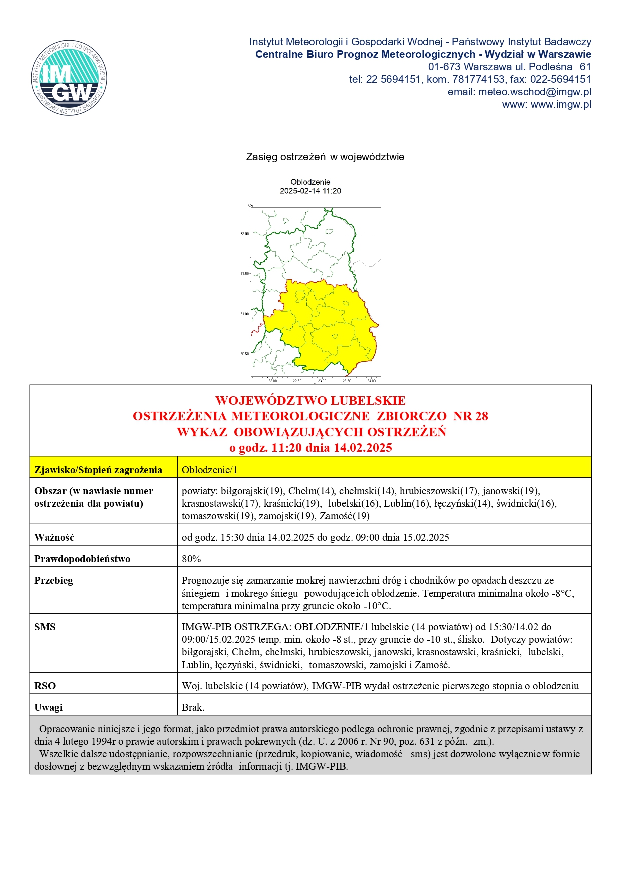 Ostrzeżenia meteorologiczne: Oblodzenie stopień: 1 prawd. 80%