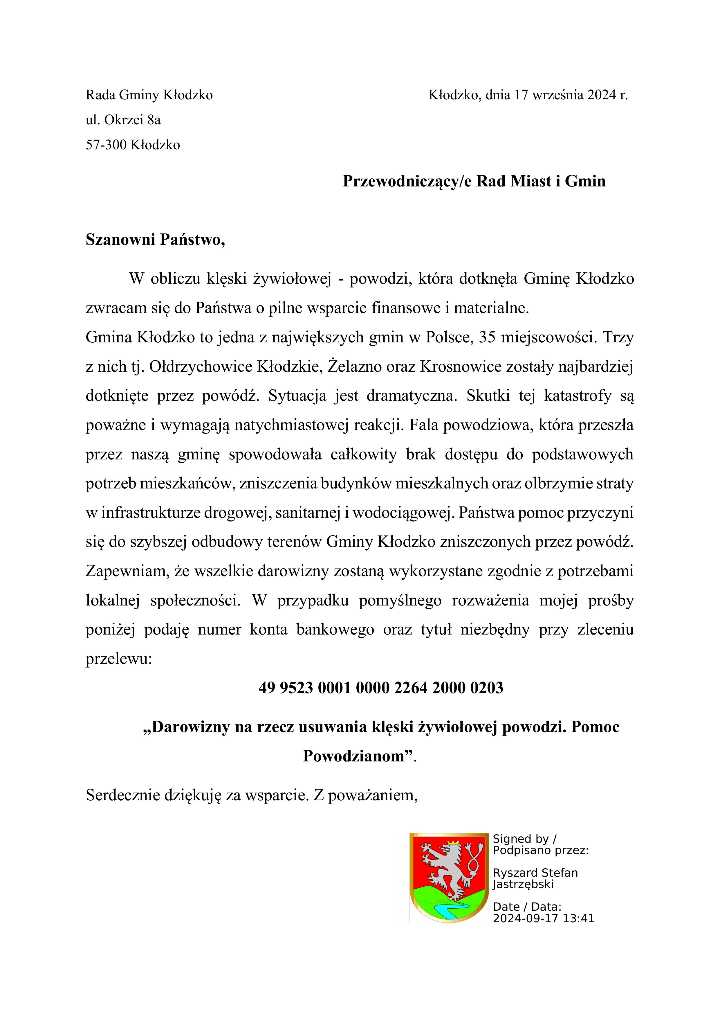 Ewentualnie wpłat można dokonywać na konto Gminy Kłodzko nr 49 9523 0001 0000 2264 2000 0009 z dopiskiem: „Pomoc dla powodzian”.