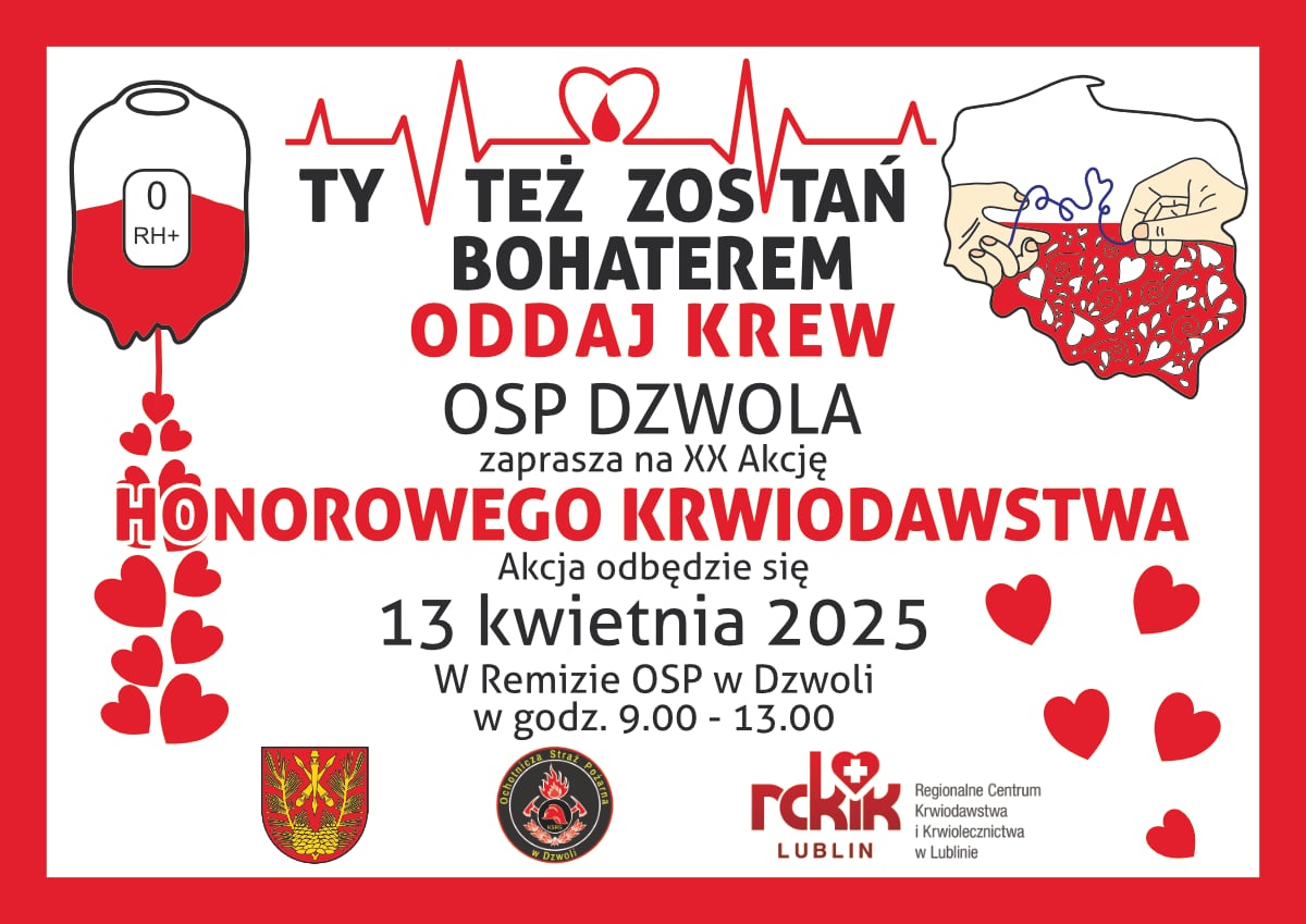 Szanowni Państwo, przypominamy, że już po raz dwudziesty Ochotnicza Straż Pożarna w Dzwoli organizuje akcję honorowego oddawania krwi.
