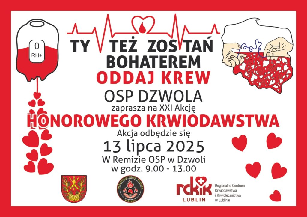 Szanowni Państwo, przypominamy, że już po raz XXI Ochotnicza Straż Pożarna w Dzwoli organizuje akcję honorowego oddawania krwi.