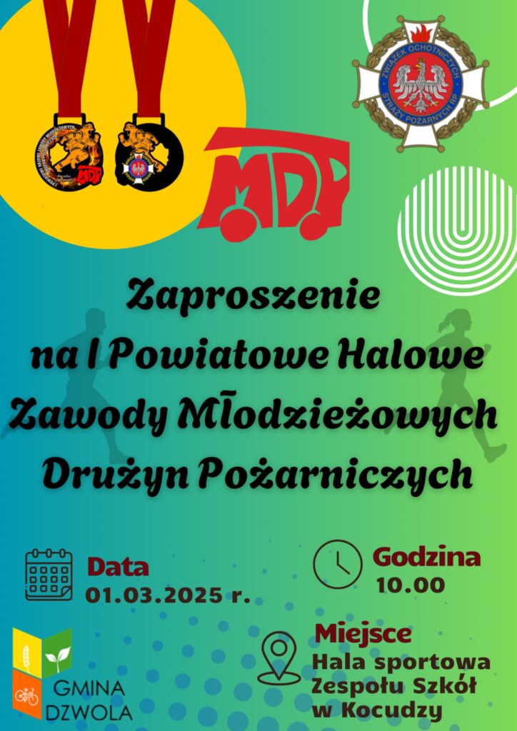 Zaproszenie na I Powiatowe Halowe Zawody MDP Opublikowano dnia: 25 lutego 2025 - 08:51 Zaproszenie na I Powiatowe Halowe Zawody Młodzieżowych Drużyn Pożarniczych, które odbędą się w dniu 1 marca 2025 r. na hali sportowej Zespołu Szkół w Kocudzy. Liczba wyświetleń: 8